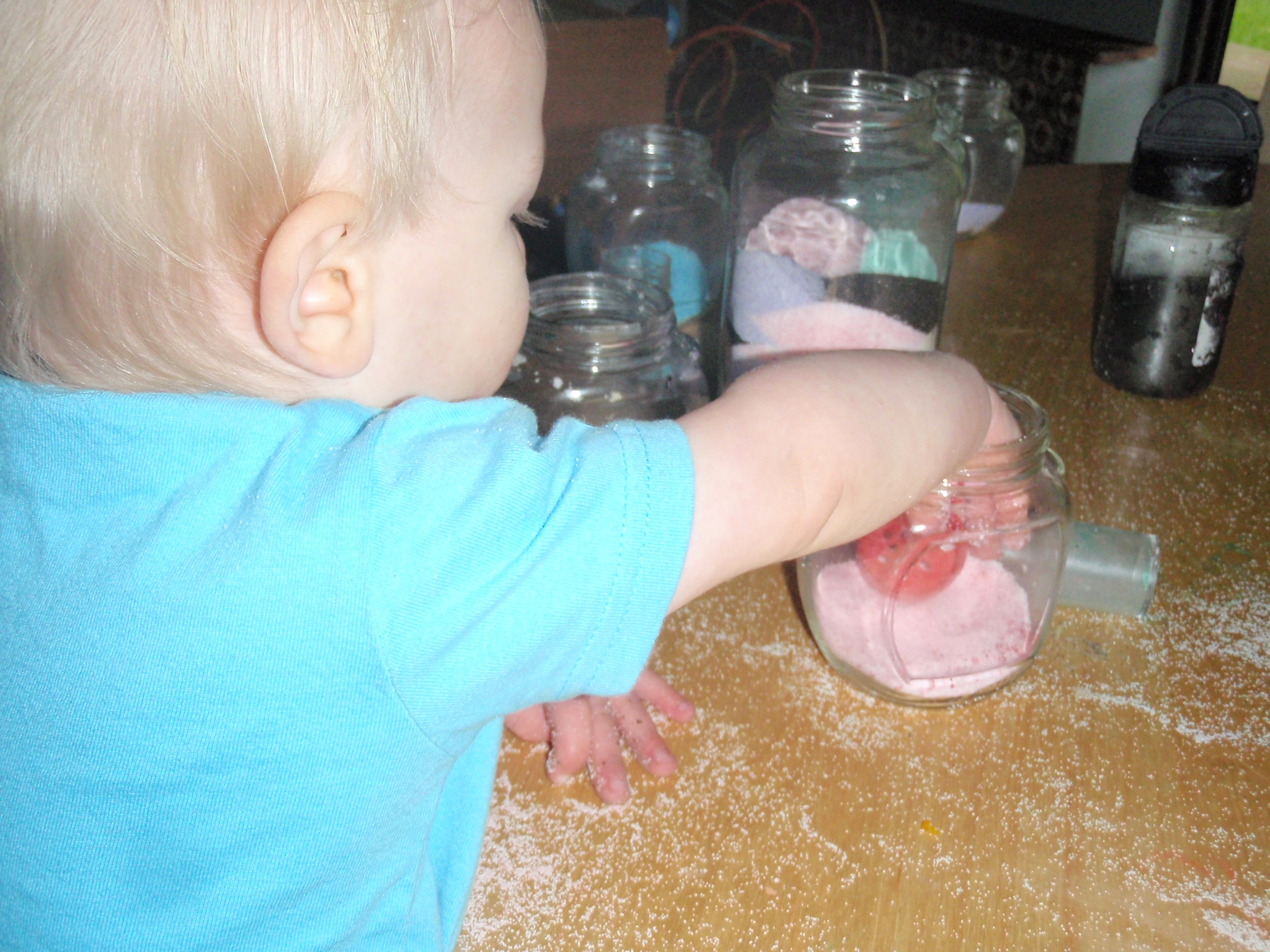Cole's birthday and daycare 087At the moment I’m taking care of a mix of older preschoolers and fresh one year old’s.  It’s been a fun challenge to find art activities that my 5 year old enjoys as much as my one year old.  ”M”- ( almost 2 years old) is obsessed with sprinkles and pouring, but sparkles and colored salt can get expensive in the quantities she loves.   So the other day, I was in my kitchen thinking about crafts and I wondered how I could do similar activities for my young ones but without spending tons  of money on sparkles.  Then I opened my cupboard and saw  huge package of salt (thinking play dough) that I had bought at Costco.   I grabbed some food coloring and with a few drops we had tons of sprinkles, in lots of color for less than a dollar.